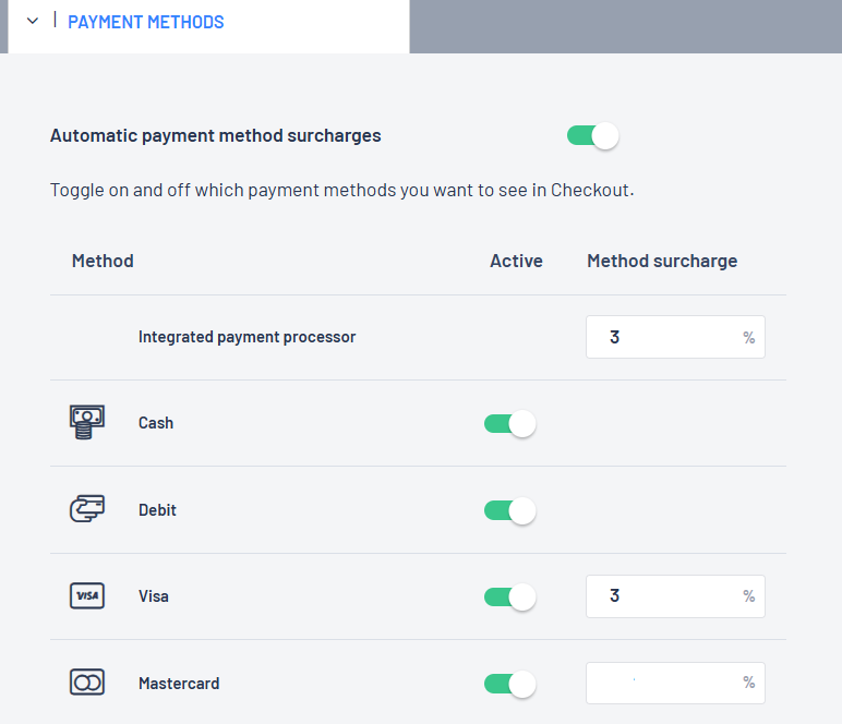 Then go through the relevant Payment Methods - Integrated payment processor / Visa / Mastercard / Amex / Discover / Preferred Payment (if applicable) and add the % that you want to charge as the surcharge to the Customer when they use that Payment Method on a Customer Order